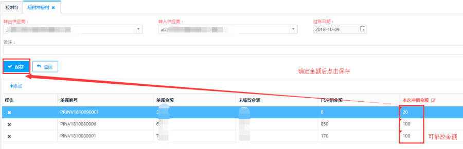 第四步:可修改本次冲销金额,确认无误后点击<保存>返回到主页面。