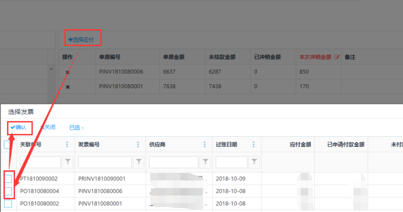 - 应付是获取主单里供应商对应的采购发票和采购红字发票
