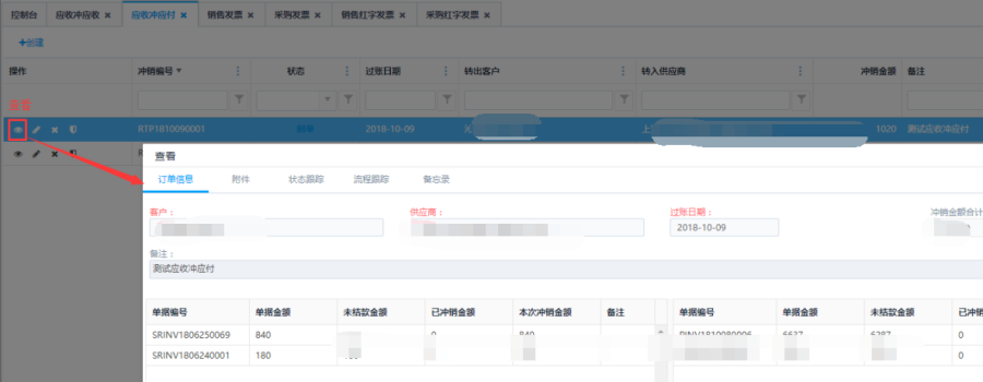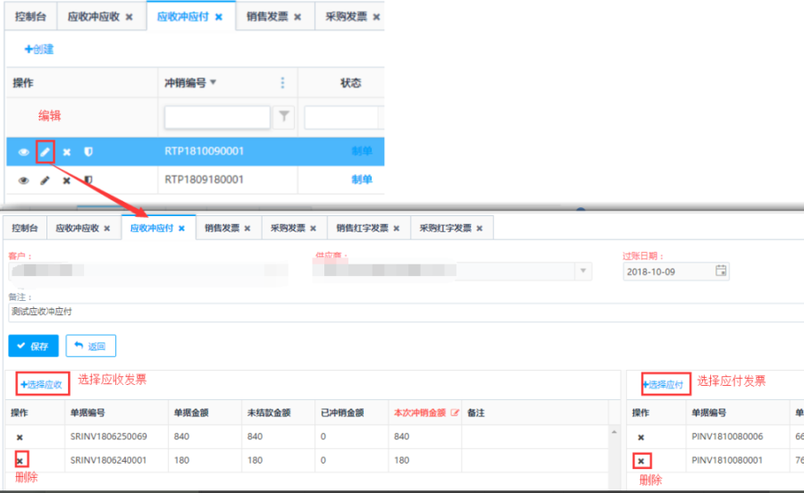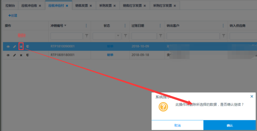 制单状态下的应收冲应付单,点击操作栏<删除>按钮可删除应收冲应付单。
