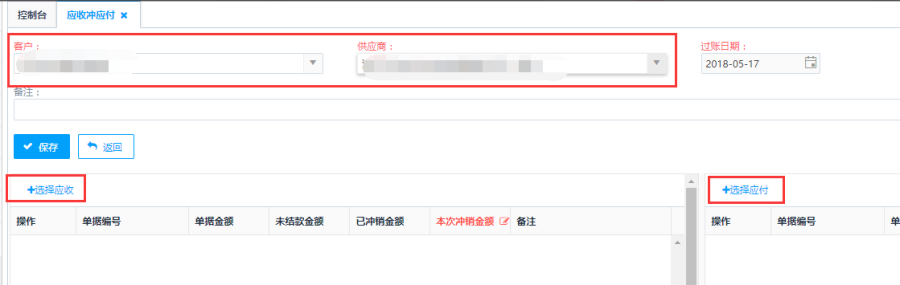 第二步:选择客户、供应商,点击<选择应收>、<选择应付>按钮分别添加销售发票(销售红字发票)、采购发票(采购红字发票)。