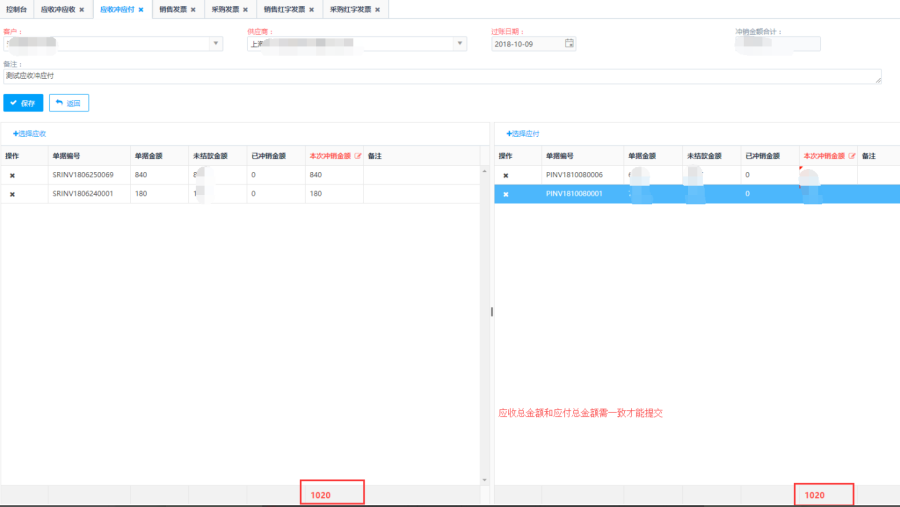 - 应收总额与应付总额要一致才可创建