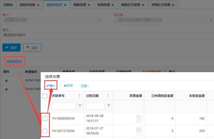 第三步:选择应收的发票和应付发票,点击左上角<确认>按钮,可将单据添加到列表里。
