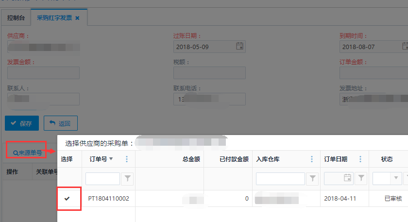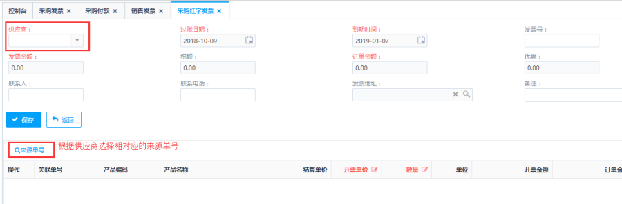 第二步:填写采购红字发票主单内容,点击<来源单号>按钮,选择关联采购退货单号。