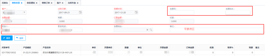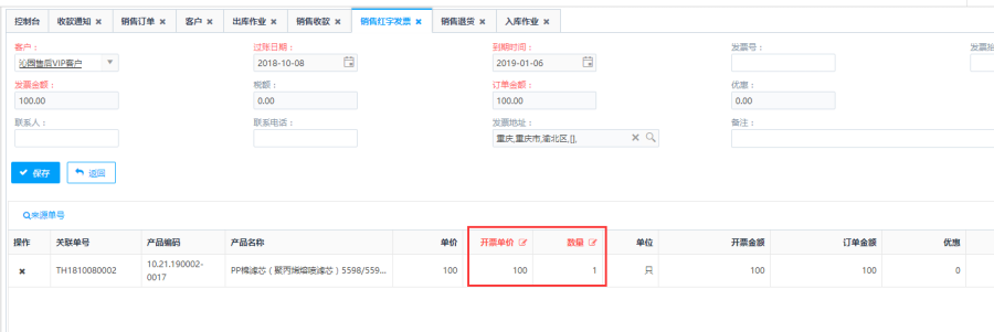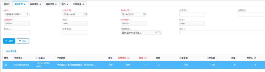 - 发票金额、订单金额:和所选择的销售单关联,选择之后自动带出【发票金额】、【订单金额】,修改了开票单价后,【发票金额】、【优惠】字段会自动更新,修改数量后,【发票金额】、【订单金额】会自动更新;