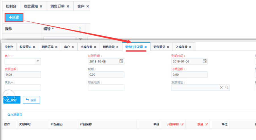 第一步:点击<创建>按钮,进入销售发票的创建页面: