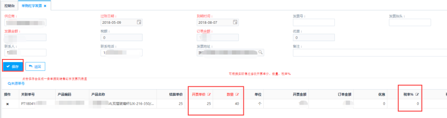 第三步:点击<保存>生成一条单据到列表里,也可根据实际情况修改开票单价、数量、税率%再保存。