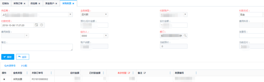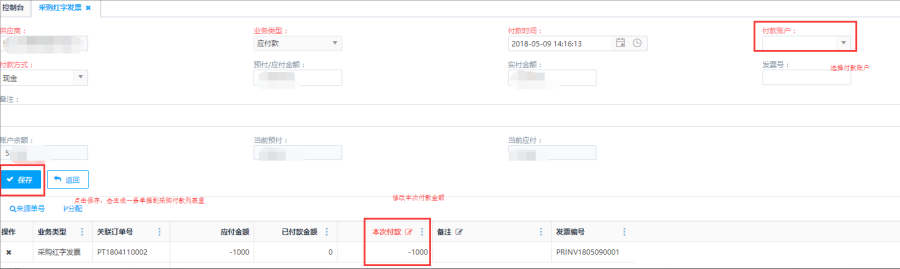 跳转到采购付款页面,选择收款账户、修改本次付款金额(部分或全额),点击保存,会生成一条单据到【财务-资金管理-采购付款】列表里,审核采购付款单后,采购发票单状态变换为"部分付款"或"全部付款"。