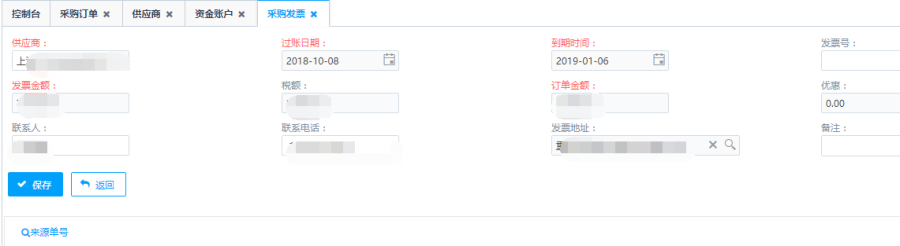 第二步:填写采购发票主单内容,点击<来源单号>按钮,选择关联采购单号。
