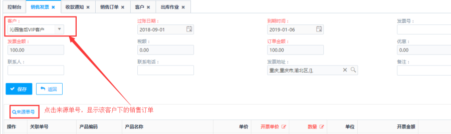 第二步:填写销售发票主单内容,点击<来源单号>按钮,选择关联销售单号。