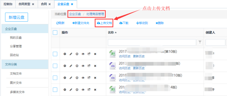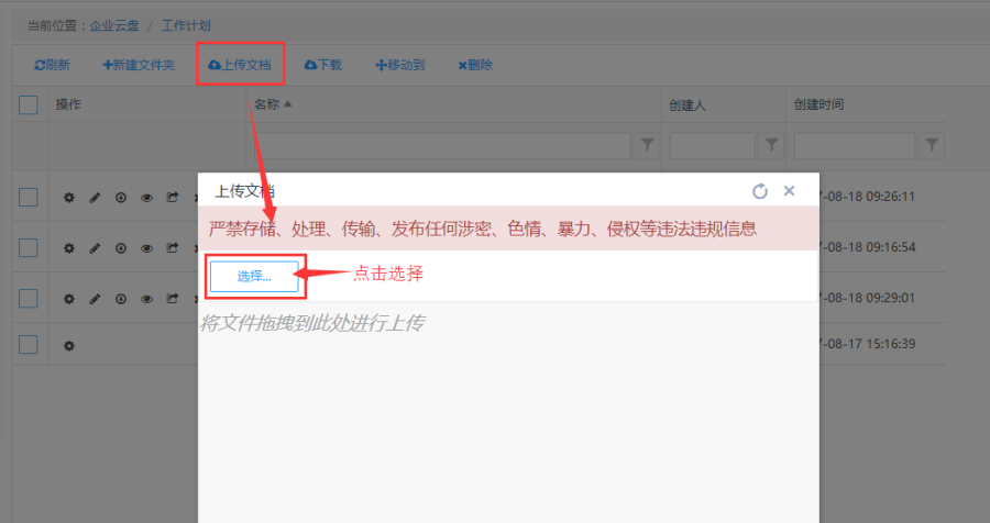云盘文件夹子目录下,点击列表上方<上传文档>按钮,可选择本地的文档进行上传。如图: