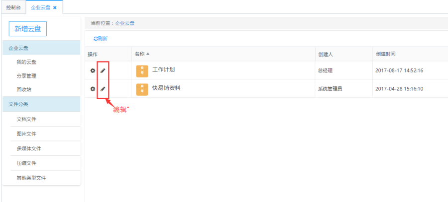 点击列表操作栏的<编辑>按钮,可对云盘进行编辑。如图: