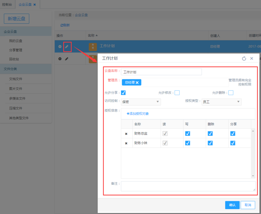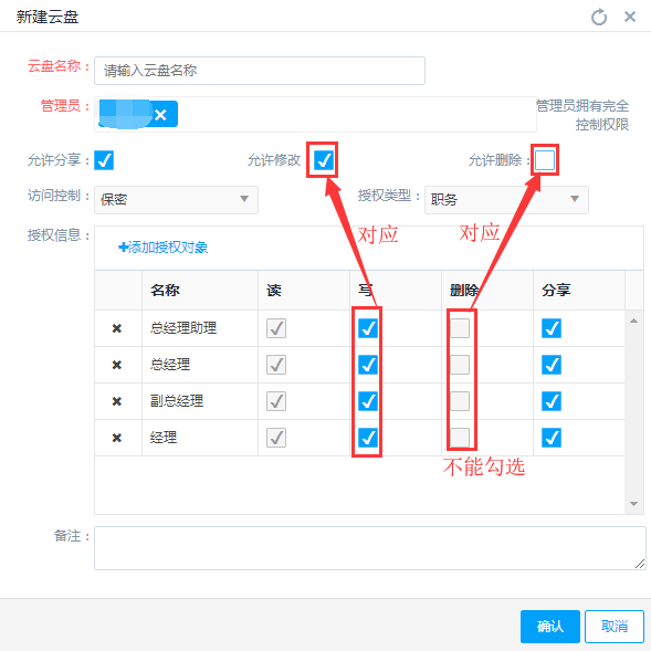 - 授权对象的权限需要跟上方"允许分享"、"允许修改"、"允许删除"相对应,例如:勾选"允许分享",那么下面授权对象可以对云盘进行分享操作。没有勾选,则不允许操作。