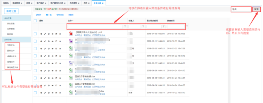 查询有三种方式:1.在筛选区进行筛选查询;2.在左边的文件分类中选择需要查询的文件类型进行分类查询;3.在右上角点击搜索框输入需要查询的内容进行搜索查询