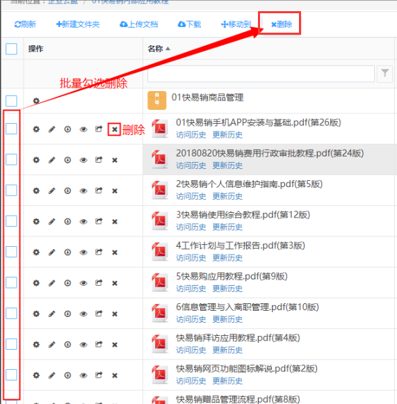 选中左侧多选框后点击列表上方<删除>按钮,可删除文件