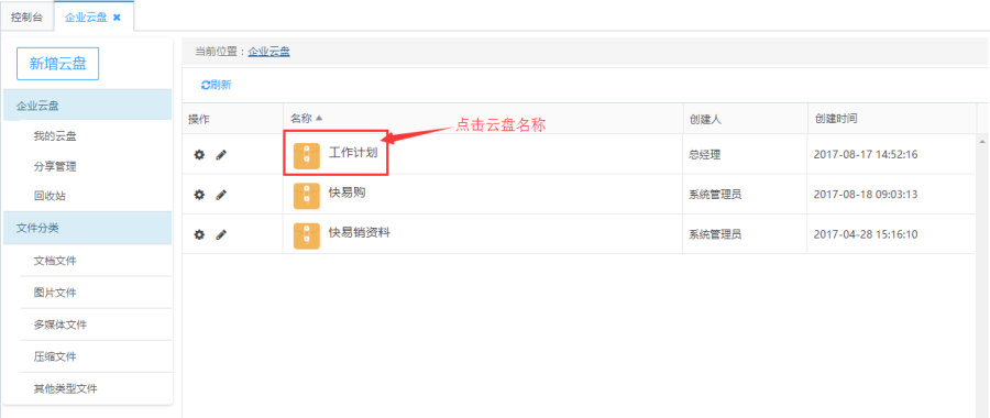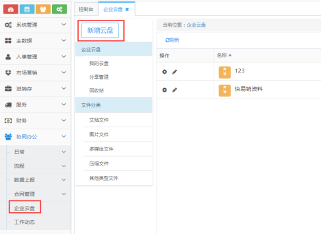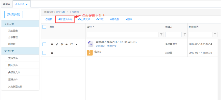 点击云盘名称,进入云盘文件夹子目录,可点击列表上方的<新建文件夹>按钮,可创建下级文件夹。如图: