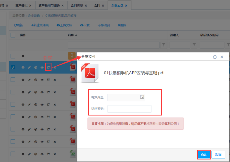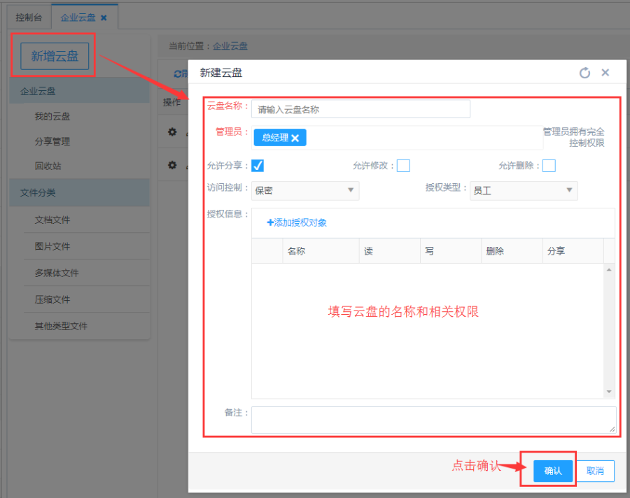 第二步:新建云盘页面,填写相关内容,点击<确认>按钮,新增完成。