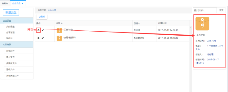 点击列表操作栏的<属性>按钮,可查看云盘的占用空间、子文件、创建人、创建时间。