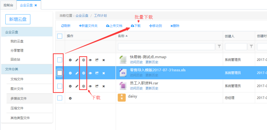 云盘文件夹子目录下,点击操作栏<下载>按钮,可下载文件。也可以选中左侧多选框后点击列表上方<下载>按钮,来进行批量下载。如图