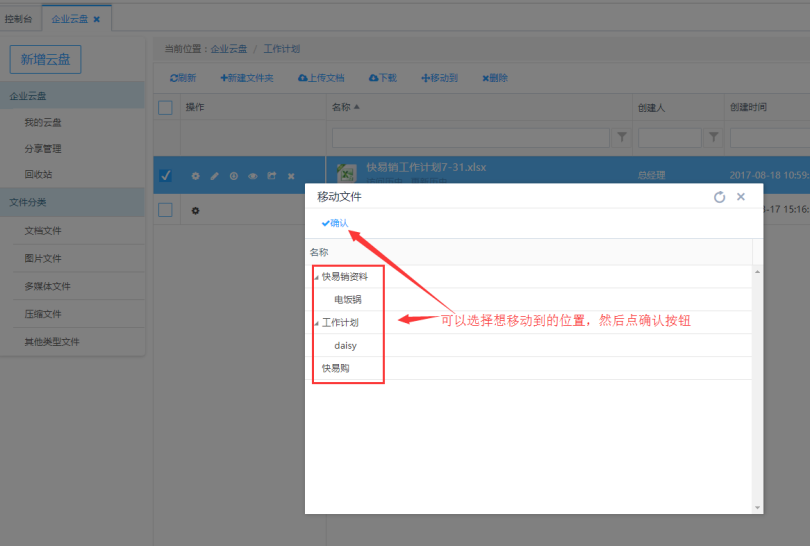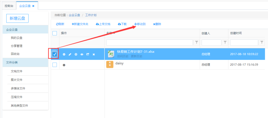 云盘文件夹子目录下,选中左侧多选框后点击列表上方<移动到>按钮,可移动文件的位置。如图