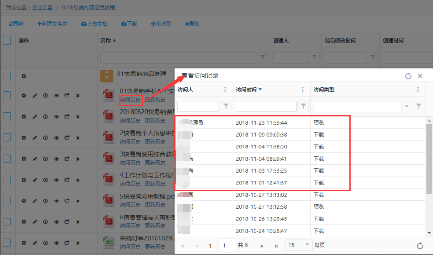 云盘文件夹子目录下,点击文档下的<访问历史>,可以查看有谁访问过该文档。