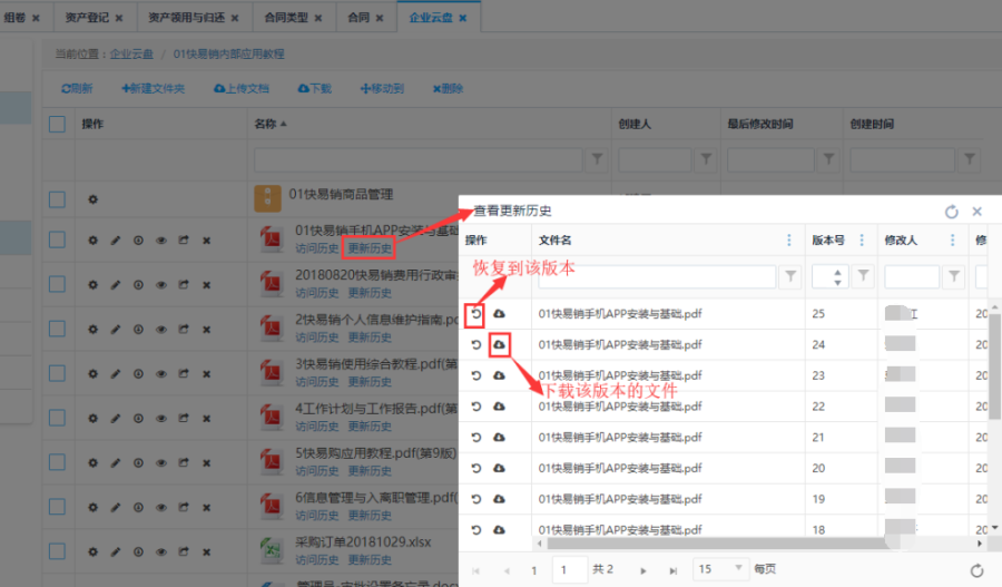 云盘文件夹子目录下,点击文档下的<更新历史>,可以查看该文档更新历史记录,并且对历史版本可以进行下载和恢复到历史版本操作。