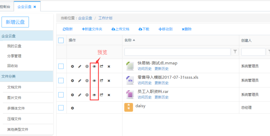 云盘文件夹子目录下,点击操作栏<预览>按钮,可预览文件内容。如图