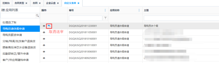 取消送审操作:审批中状态的自定义表单,点击操作栏的<取消送审>按钮,可对表单进行取消送审操作,取消送审后,表单状态显示"草稿"。