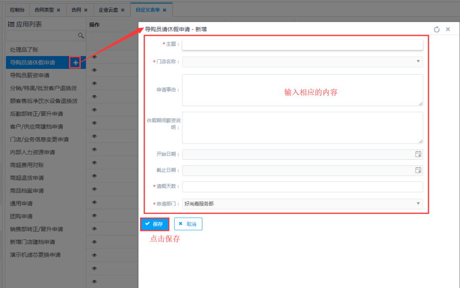 第二步:在新增界面,输入相应的内容,然后点击<保存>按钮,完成自定义表单的创建。