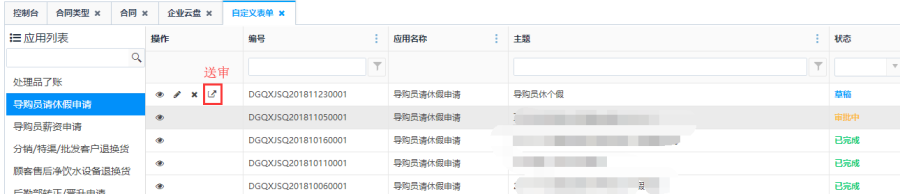 送审操作:草稿状态的自定义表单,点击操作栏的<送审>按钮,可对表单进行送审操作,送审后,表单状态显示"审批中"。