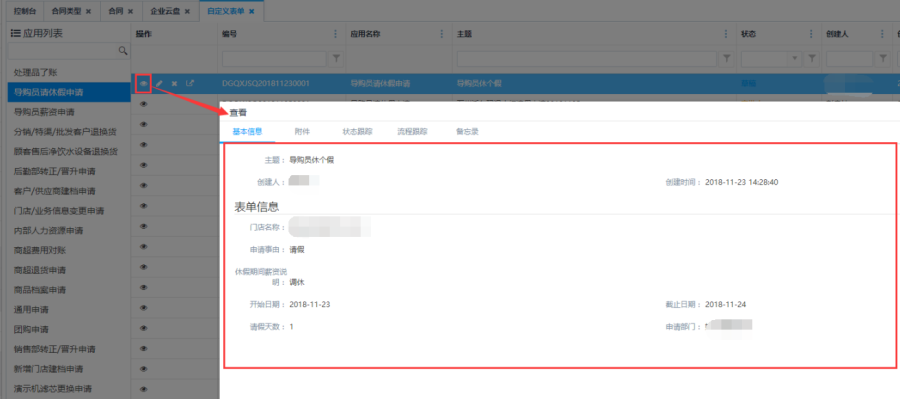 查看操作:点击对应的表单或点击<查看>按钮可以进入到表单详情界面,查看当前表单信息。