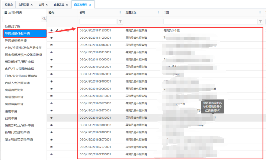 查看该类型下的所有表单只需要点击左边类型名称即可显示所有自定义表单列表。