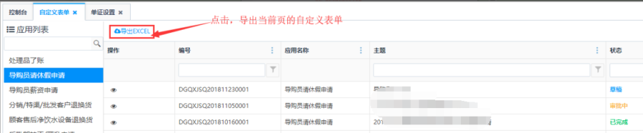 点击列表上方的<导出EXCEL>按钮可导出自定义表单列表内容。