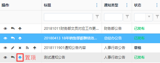 点击操作栏<置顶>按钮,可置顶通知公告。