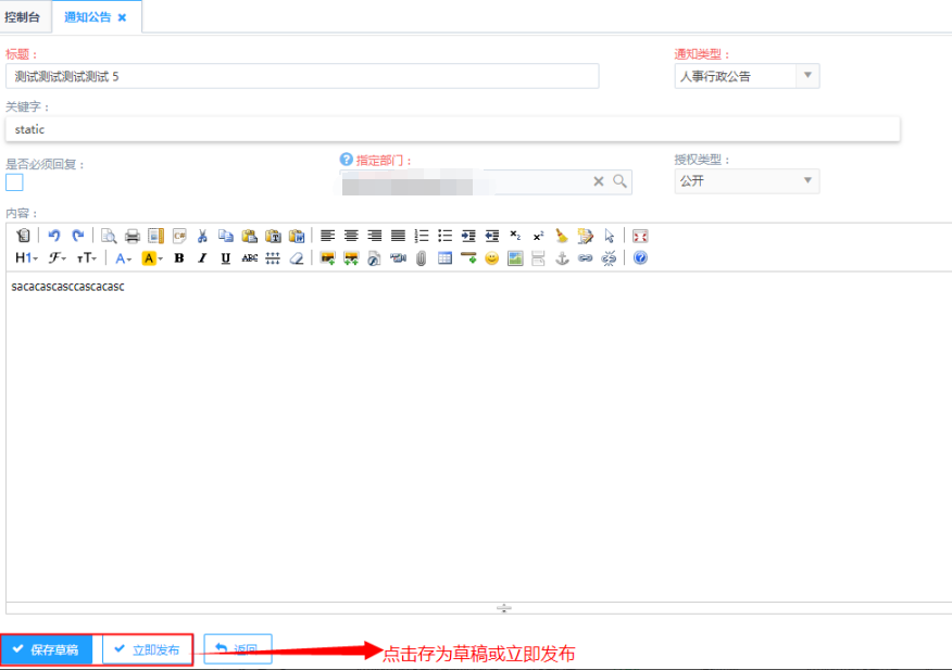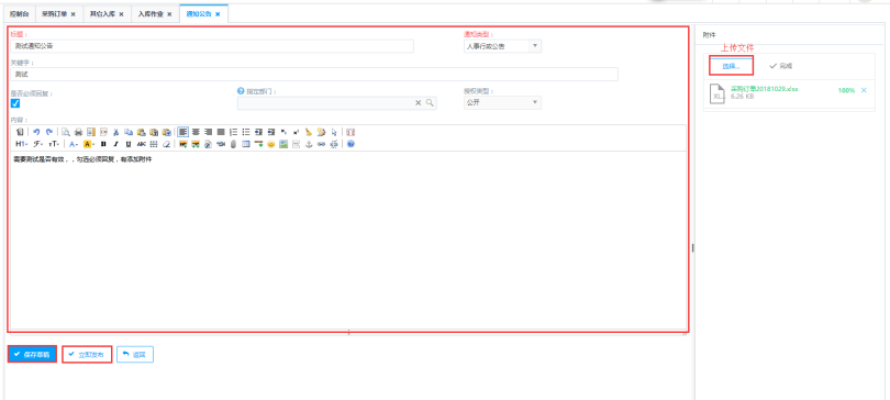 第二步:编辑通知公告内容,点击<立即发布>按钮,可以使通知发布到指定部门,状态显示"已发布";点击<保存草稿>按钮,则该通知公告存为草稿,状态显示为"草稿"。