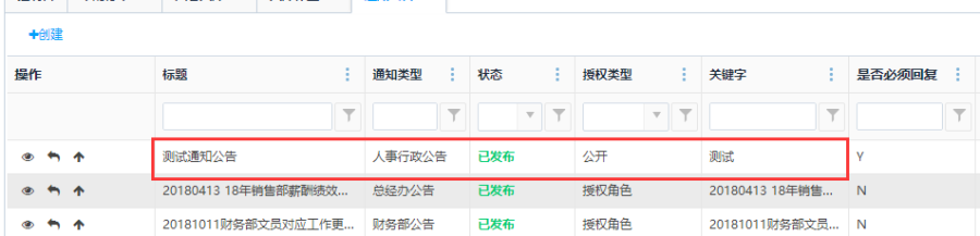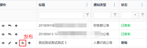 草稿状态的通知公告,点击操作栏<发布>按钮,可发布通知公告。此时,通知公告的状态从草稿更改为已发布。