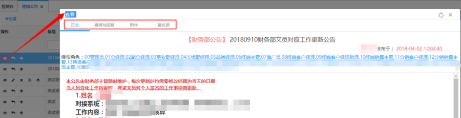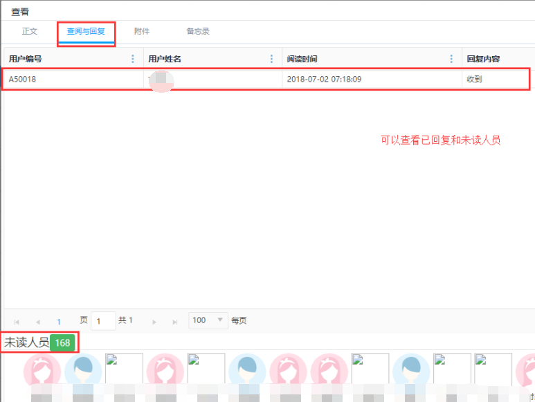 - 查阅和回复:可以查看已回复和未读人员信息;