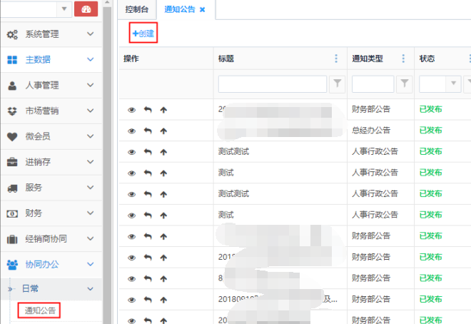 第一步:点击<创建>按钮,进入通知公告的创建页面: