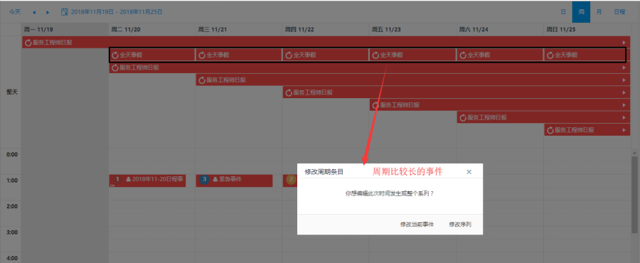 选择周期比较长的事件,双击事件,弹出修改周期条目框,点击【修改当前事件】或点击【修改系列】进入编辑页面,编辑修改内容。
