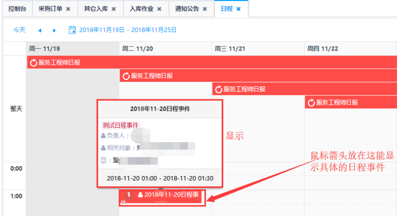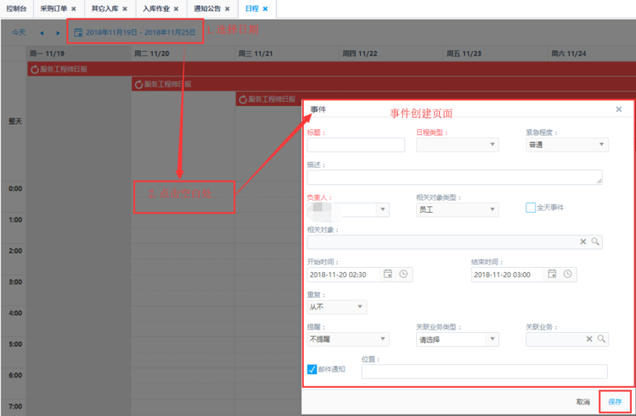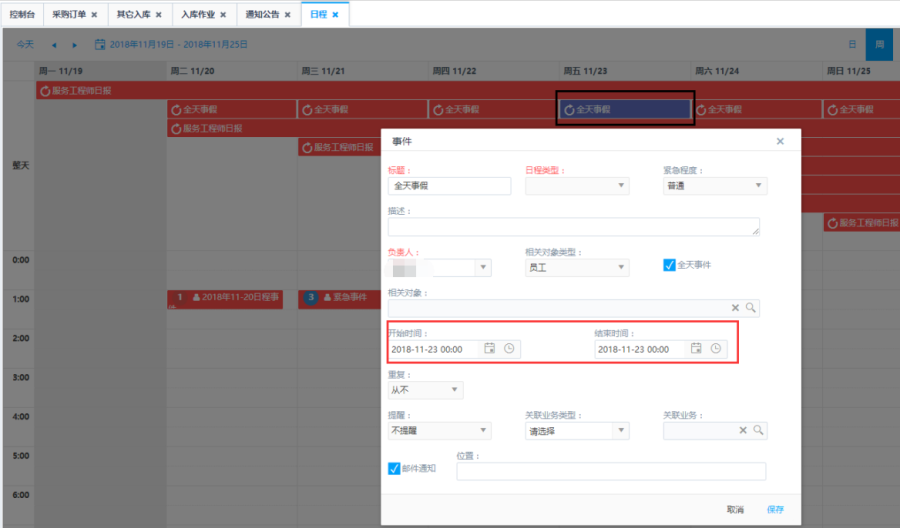 - 开始时间和结束时间是按半个小时为单位;勾选"全天事件"后开始时间和结束时间为24小时。