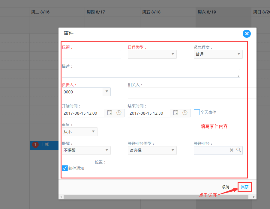 第三步:填写好事件内容,点击<保存>按钮,完成创建。