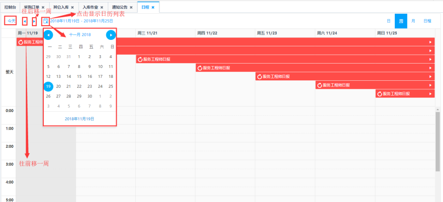 注:推动按钮需关联右上角的日、周、月按钮进行向前或向后推动