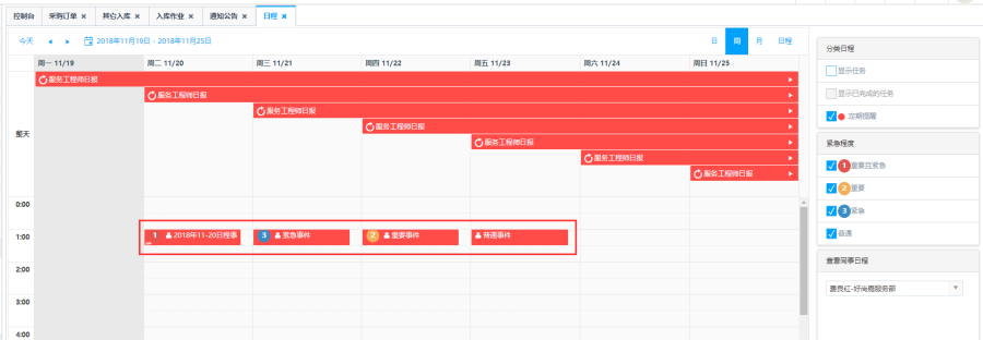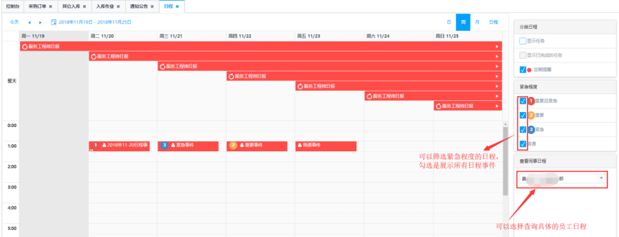 可根据分类日程、紧急程度和查看员工日程进行筛选查询。