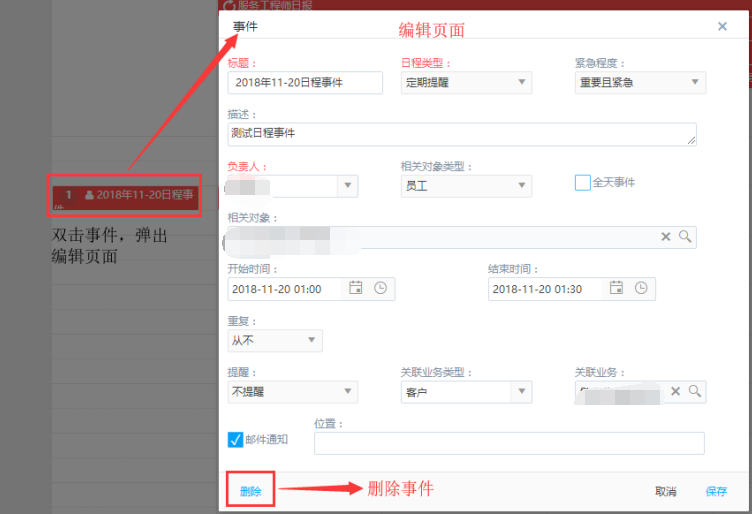 双击创建的事件,进入编辑页面,可进行编辑和删除的操作。