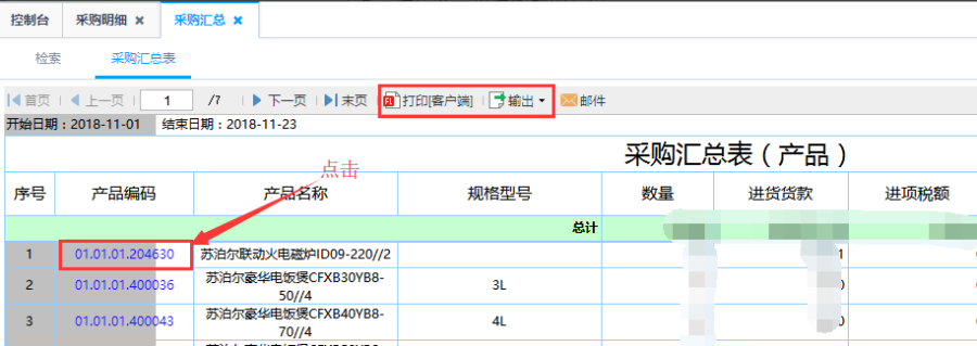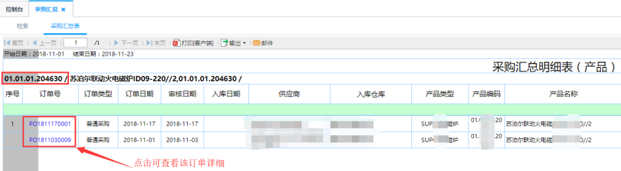 第三步:根据对应筛选条件查询得出采购汇总表。针对采购汇总表中的产品编码点击可查看到该产品的采购明细信息,具体到每一个订单信息。