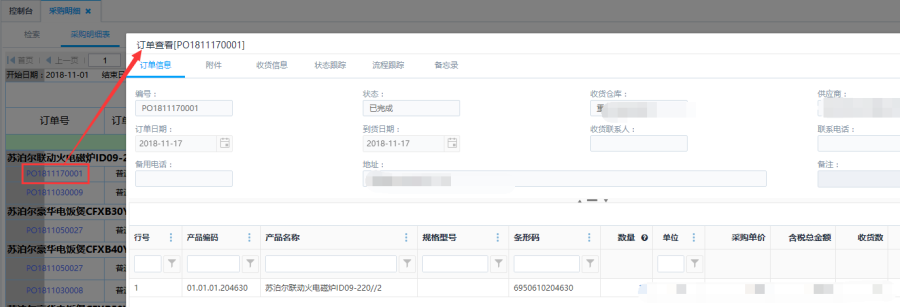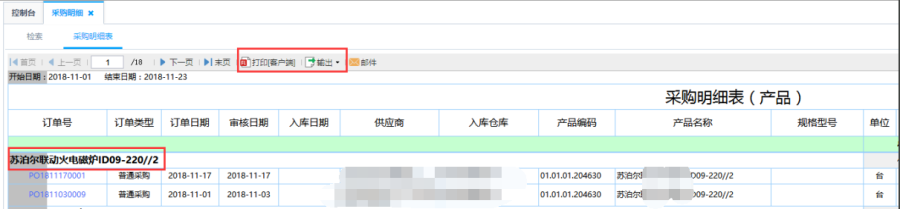 第三步:根据对应筛选条件查询得出采购明细表。采购明细表具体到每一个产品所对应的订单号,根据明细表可以查看单据中产品的个数以及成本。