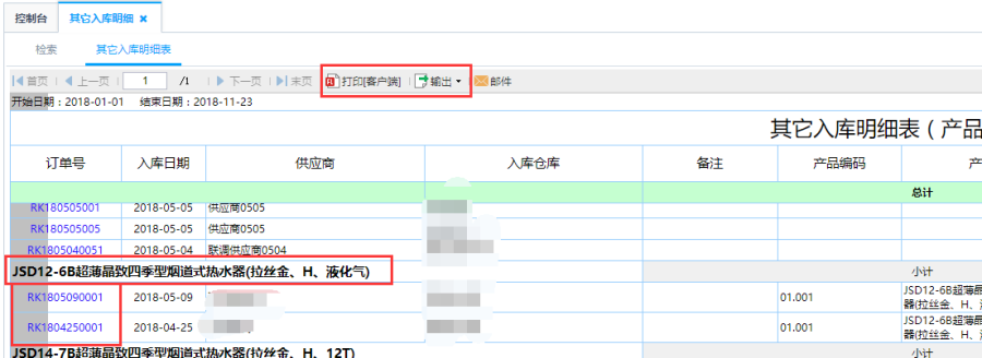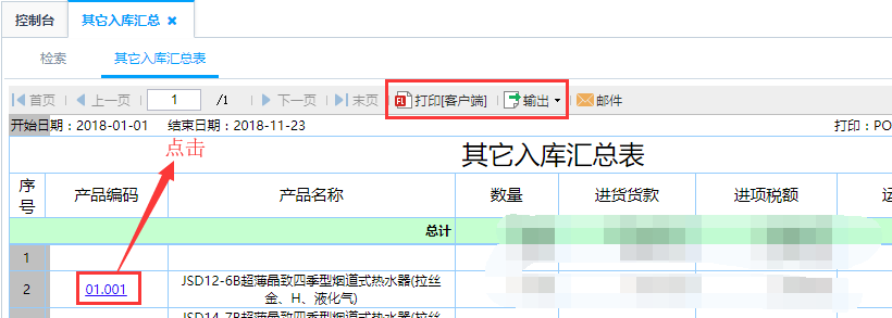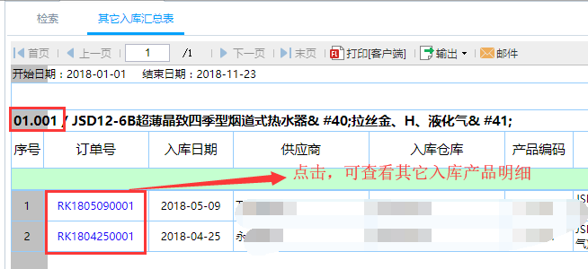 第三步:根据对应筛选条件查询得出其它入库汇总表。针对其它入库汇总表中的产品编码点击可查看到该产品的其它入库明细信息,具体到每一个订单信息。