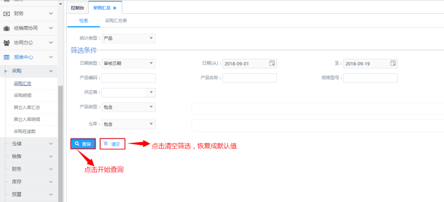 访问路径:报表中心—采购—采购汇总