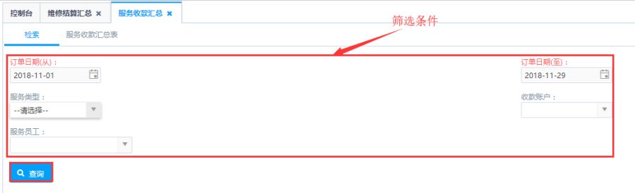 第一步:根据筛选条件进行查询,针对订单日期、服务类型、收款账号、服务员工筛选条件根据实际需求进行选择。