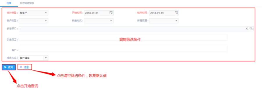 第二步:根据筛选条件进行查询,包括:开始时间、结束时间、客户类型、销售方式、所属渠道、销售部门、负责员工、客户、排序方式;