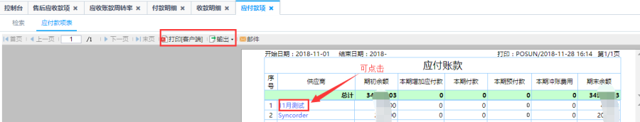第二步:点击查询即可得到应付款项表,针对指定供应商在限定时间内统计出的应付账款,从应付账款表可点击供应商查看其应付账款明细,同时可以查看订单的详细信息。